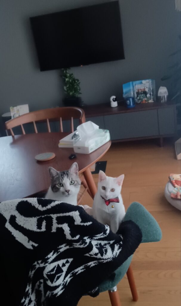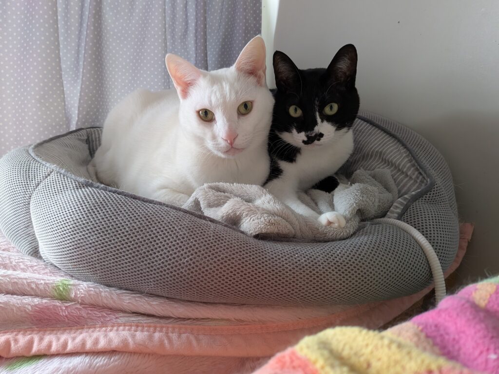 我が家より中継します。アニマルクラブに住み着いていた野良猫パンダが、町内より連れてきた白雪が家に来てから、僕が前の飼主の虐待から受けたPTSDも改善しました。仲間ってイイね!